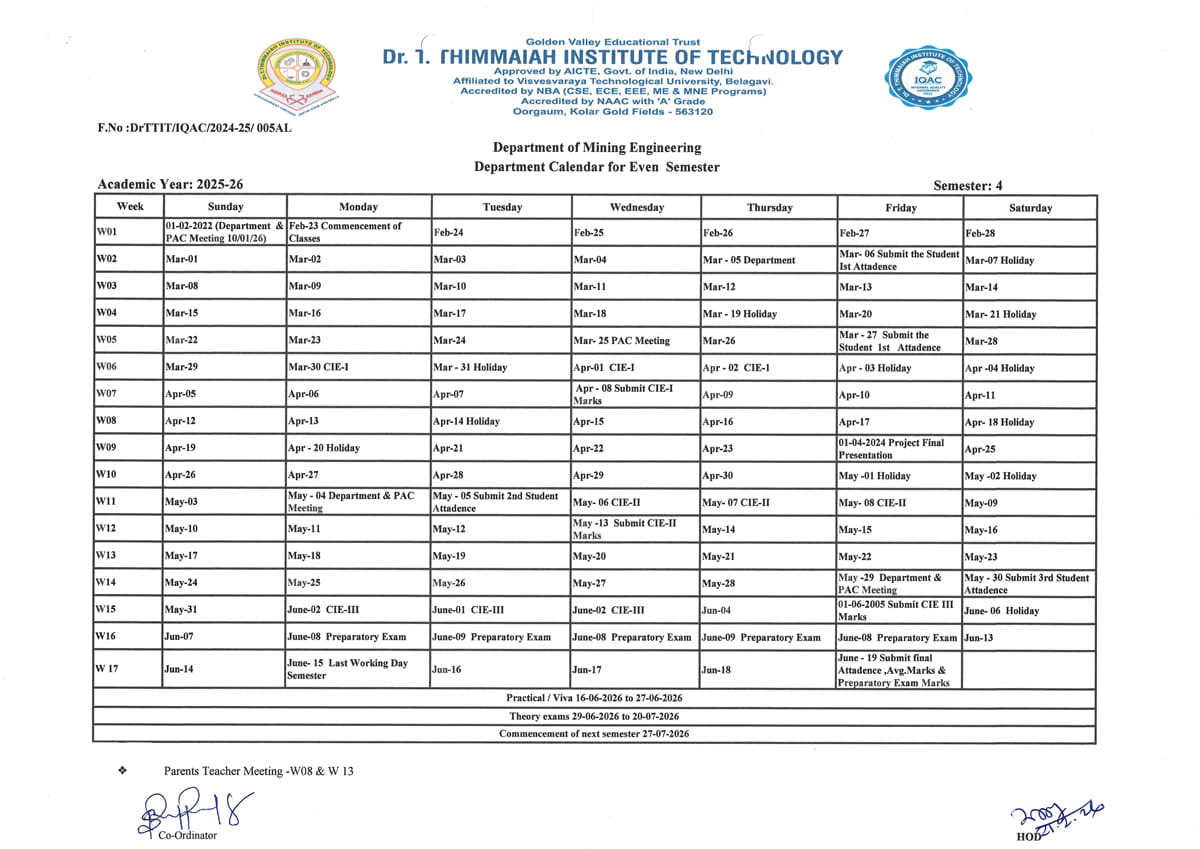 - To impart Quality Education for meeting the needs of the Mining Engineering Profession &